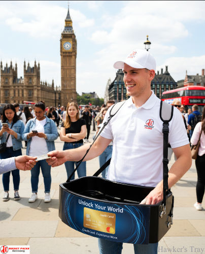 Compact vendor’s tray at Edinburgh Fringe Festival for mobile beverage sales and brand appearance through human-to-human marketing.